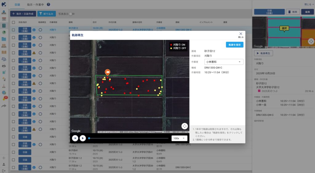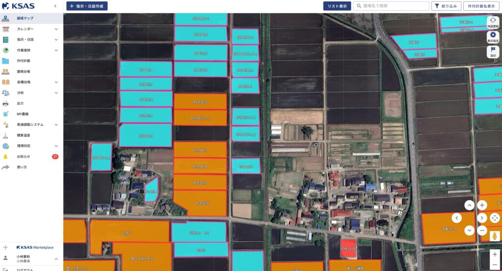 - 圃場(田畑)管理: 電子地図上で圃場の場所、面積、作付情報を一元管理。