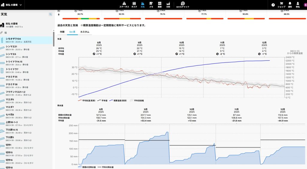 AIが気象データや品種情報を分析し、**「いつ頃に出穂するか」といった生育ステージや、「4日後にいもち病が発生するリスク」**などを予測し、アラートで通知します。